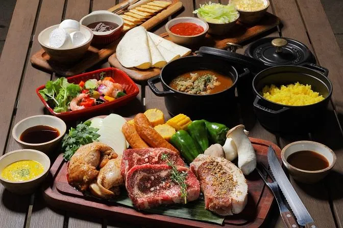 ウェーバー社の高級グリルで美味しくジューシーに調理できるよう、厚めにカットされたリブロースステーキや岩中豚はインパクト大。お肉が焼けるまではシュリンプと彩り野菜のマリネを堪能。締めにはスパイシーなひよこ豆と豚肉のスープカレーがおなかを満たします。