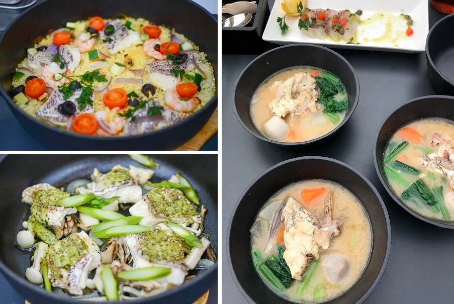 この時間は特に密に気を付け、講師の先生の手元がわかるように各テーブルにipodを配布しzoomで動画配信し、前で見たい子供たちにはルールを守って見学していただきました。講義で少し退屈してしまった子もいましたが、捌くことはとても楽しみにだったようで、みんな目をキラキラ輝かせ見学していました。魚の形、ウロコがあること、内臓、、、捌かれていく魚を見つめる子供たちは興味津々。さらに調理の講師が登場し、真鯛のパエリア、真鯛とキノコの白ワイン蒸しをレクチャーしてくれました。