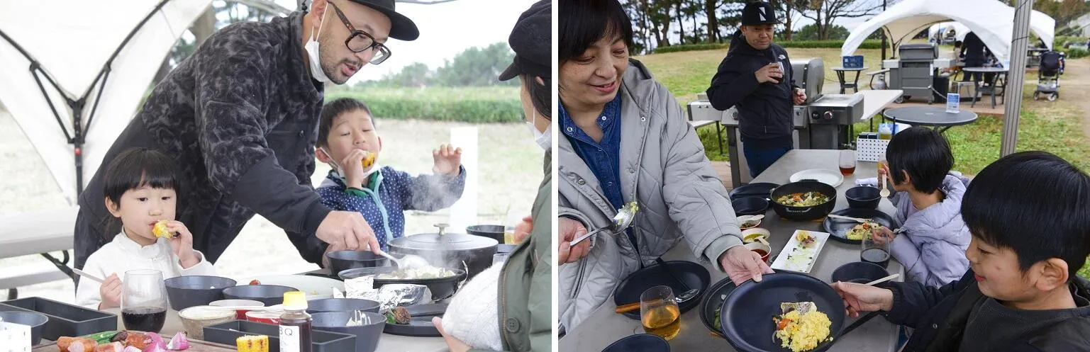自分たちが捌き、調理した「パエリア」や「白ワイン蒸し」に加え、生産者の生で食べてほしいという想いで提供された「真鯛のカルパッチョ」と捌いた後に残った骨や頭で「あら汁」、さらにお肉やお野菜のBBQを楽しみました。
