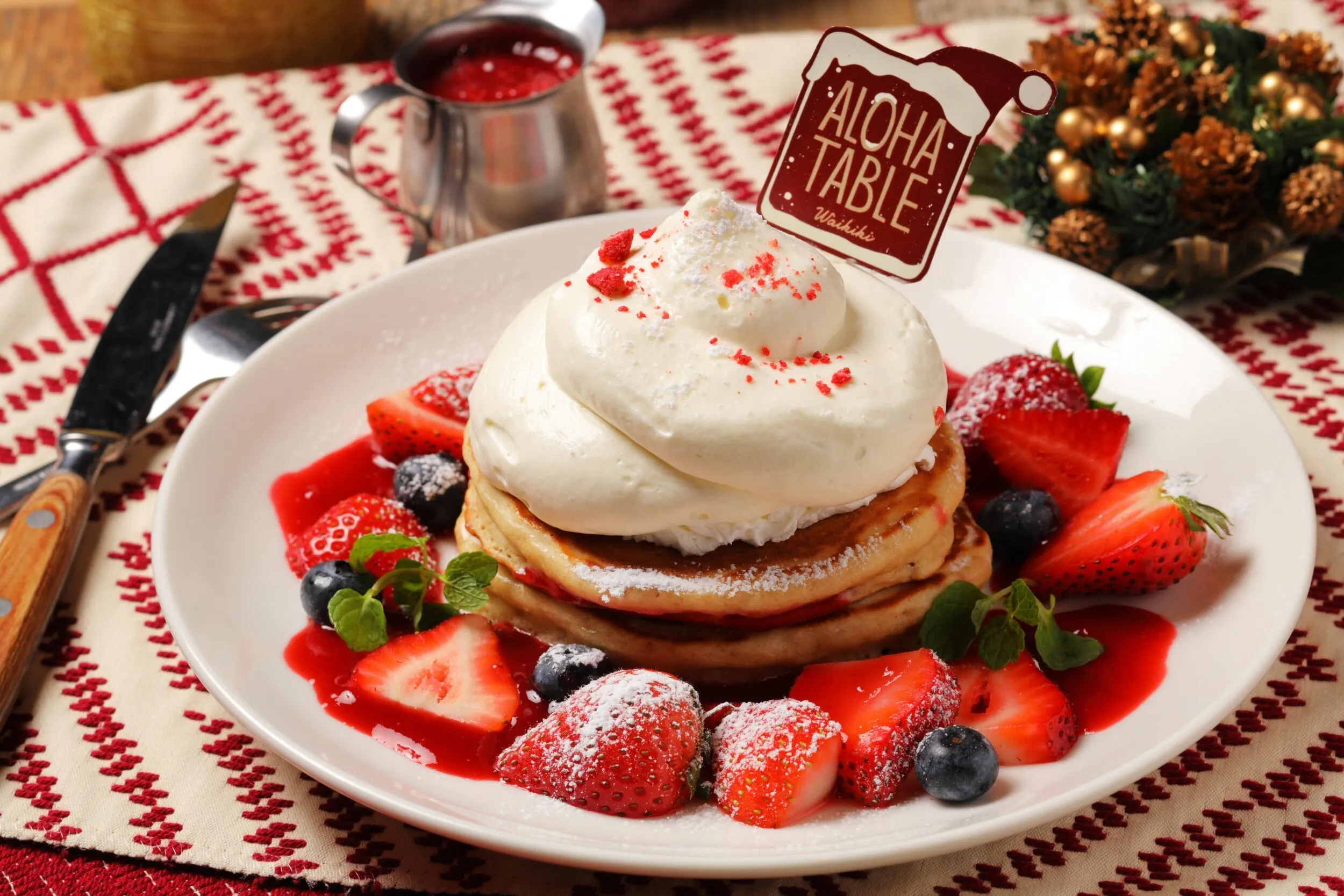 アロハテーブル特製のモチモチしっとり食感のパンケーキ生地の上には、クリームチーズと練乳で作り上げたふんわりクリームで雪山をイメージしました。ふんだんにあしらったいちごとブルーベリーが、テーブルを華やかに彩ります。甘みと酸味のバランスが良いいちごソースをたっぷりかけてお楽しみください。更に今年は、この期間だけのアロハテーブルオリジナルのデコレーションピックで、クリスマス気分を演出します。