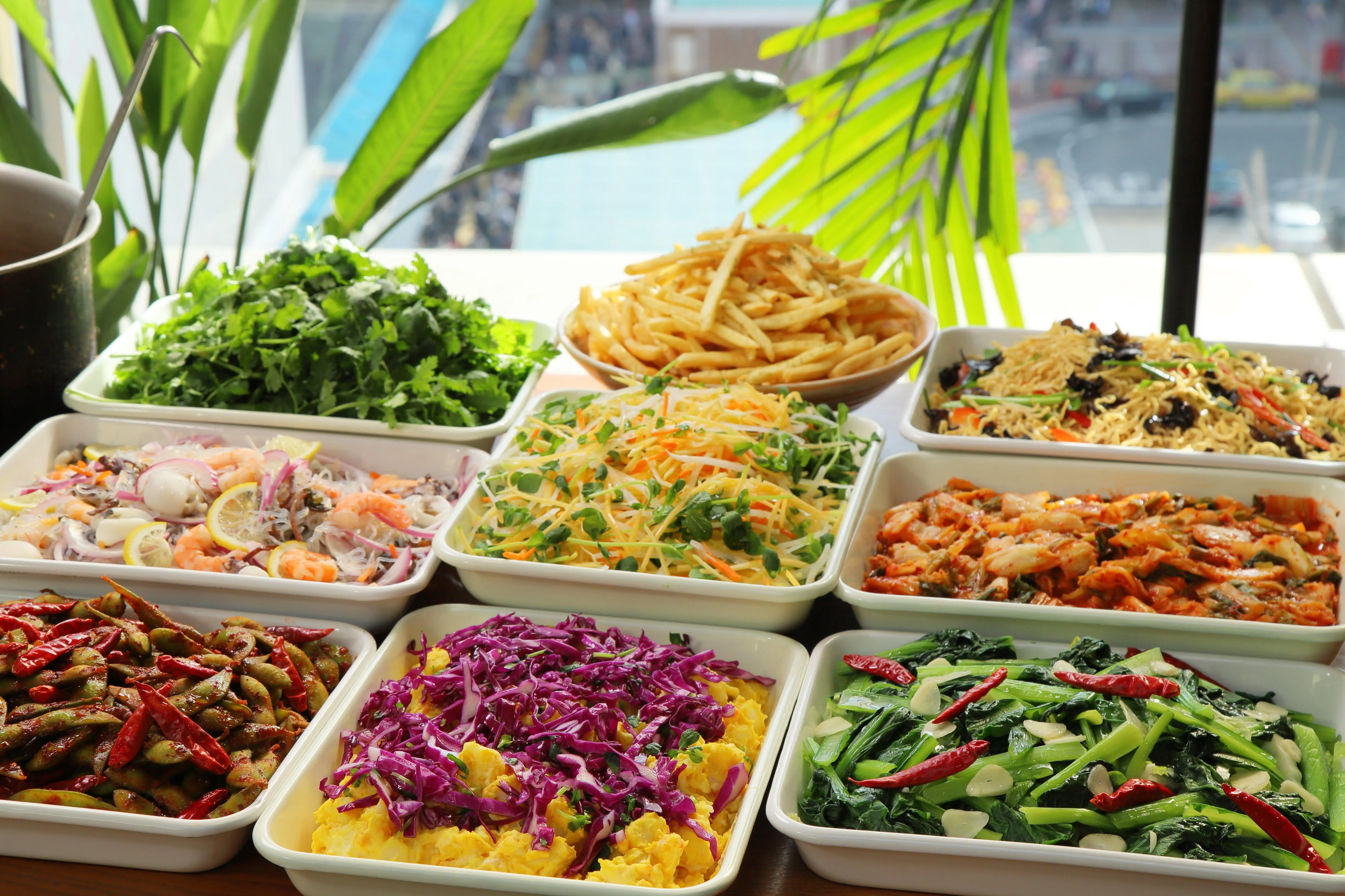 ⿇辣豚カルビやごま味噌豚肩ロース、旨⾟鶏せせりなどさまざまな味付けのお⾁や、彩り豊かなエスニック・タパスが⾷べ放題。さらに、お⼦様が⼤好きなハンバーグやカレー、ポテトやかき氷など、バラエティに富んだメニューがバイキングスタイルでお楽しみいただけます。