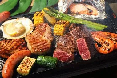 黒毛和牛、鹿児島産豚の塩麹マリネ、清流鶏もも肉、霧島黒豚ウィンナー、南九州白姫エビ、北海道産ホタテ、信州サーモン、焼き野菜(国産グリーンアスパラ、淡路島玉ねぎ、国産エリンギ)