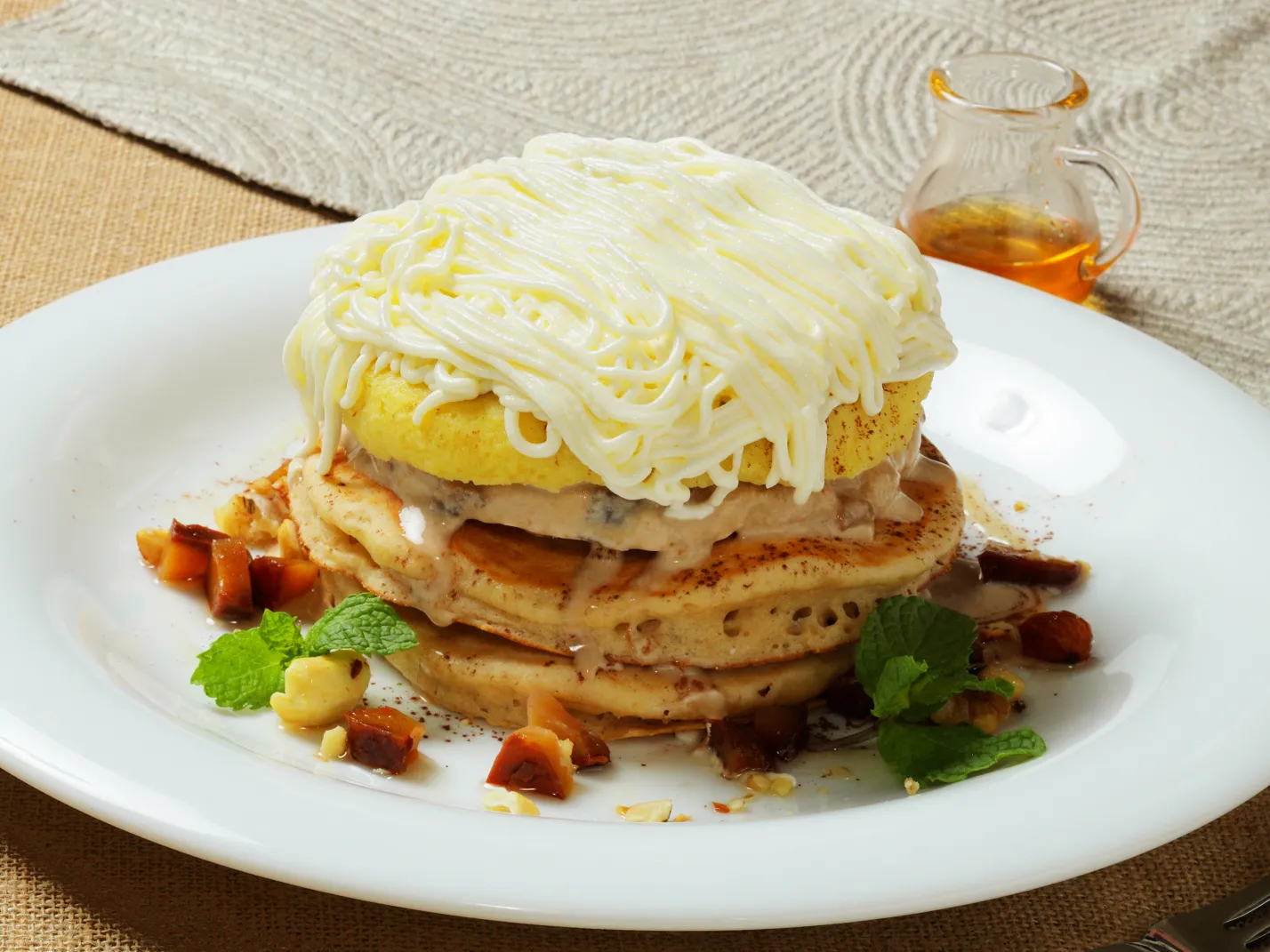 栗の渋皮煮アイスとマロンペーストに、クリームチーズホイップをたっぷりかけた真っ白なパンケーキ。栗の甘みとクリームチーズの爽やかな味わいがもちもちのパンケーキとマッチ。