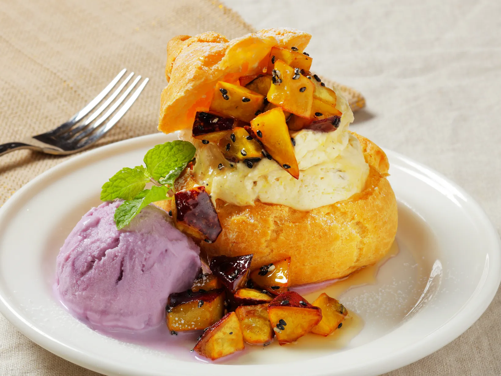 ココアカスタードに加え、さつまいもクリーム、紫芋アイスのたっぷり入ったココパフをご用意。