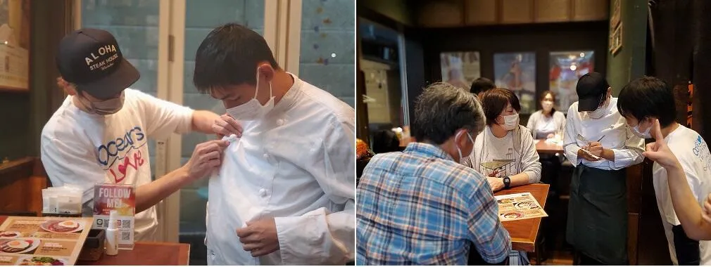 メニューはアロハテーブルの人気メニューであるプレミアム・ロコモコ、モチコフライドチキン・プレートを提供。飲食店にとって重要な衛生管理については、手洗いや手袋の着用などの大切さも学んでいただきました。