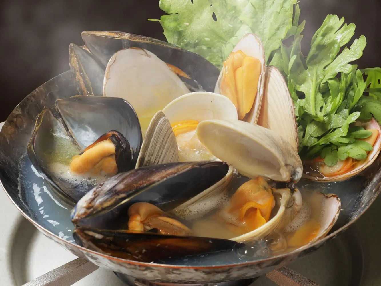 白貝、はまぐり、ムール貝の旨みが溶け込んだスープまで美味しい絶品鍋。寒い季節にぴったりのアツアツ小鍋をお楽しみください。
