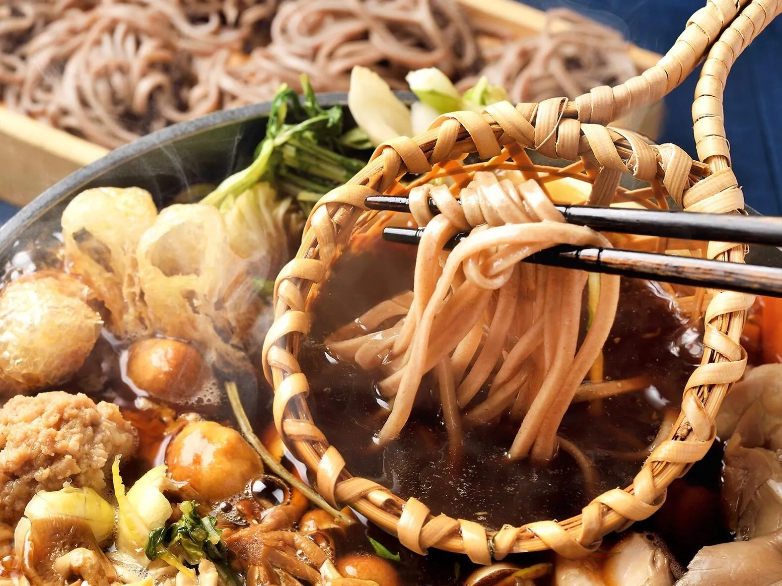 名古屋コーチン・鰹・昆布から取ったスープに、蕎麦のかえしを加えた味わい深いお出汁に、桜島鶏、鴨つくね、たっぷりのキノコを入れ召し上がっていただきます。