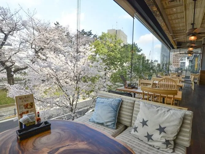 飯田橋駅西口の商業施設「飯田橋サクラテラス」にある「アロハテーブル飯田橋」。ビルと隣接する外濠沿いには多くの桜が植えられており、店内の大きな窓から桜がお楽しみいただけます。期間限定のお花見プランや桜ドリンクもご用意。