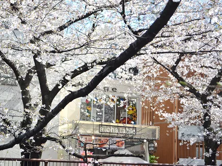 目黒川は、約4kmにわたり桜並木が広がる人気スポット。目黒川沿いにあるアロハテーブル中目黒ではお花見前後のランチやカフェ、ディナーにご利用いただけます。またテイクアウトいただける軽食やドリンクを販売いたします。ぜひお立ち寄りください。