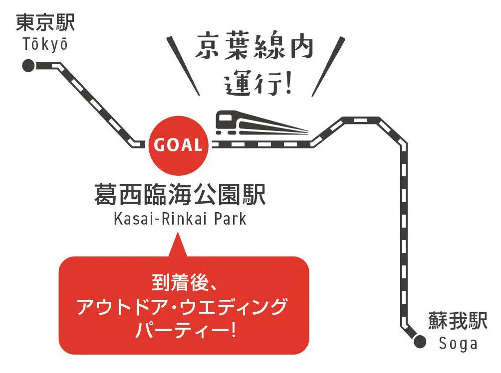 蘇我駅(12:15発/新郎新婦・ゲスト乗車)→東京駅(折返し)→葛西臨海公園駅(14:04着)