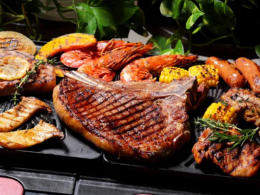 厚切り⾻付ビーフ、ジャークチキンマリネ、粗挽きソーセージ、マグロのハーブマリネ、⾚海⽼、焼き野菜(スイートコーン、エリンギ、⽟ねぎ、かぼちゃ)