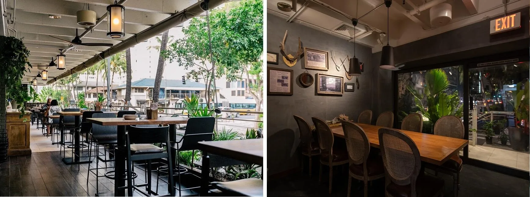 ハワイアンビンテージの重厚感の中に緑が溢れるクラシックな店内。バー&ダイニングスペースと、ハワイならではの空気を体感できる開放的な屋根付き大型テラスを完備。さらには特別な夜を演出する、VIPルームを設けました。