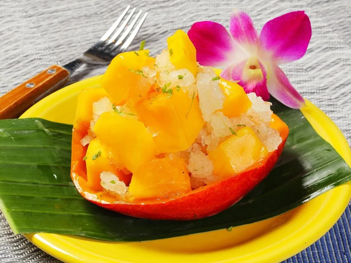 フローズンマンゴーにミントとレモンの爽やかでさっぱりしたグラニテを合わせた夏におすすめのひんやりスイーツ。