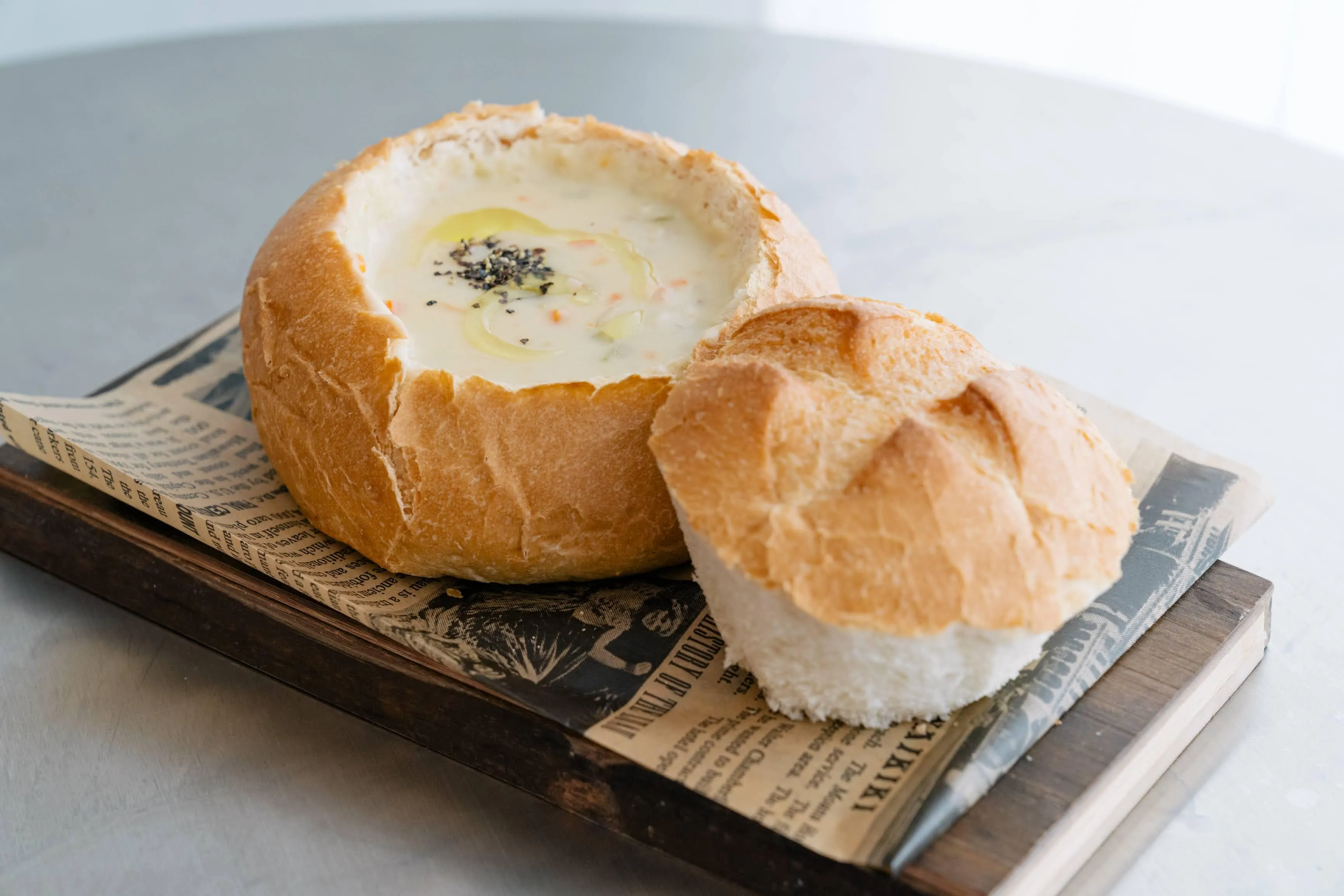 フレッシュなアサリやはまぐりをふんだんに使ったホワイトソースベースのボストンクラムチャウダー。シーフードとの相性が良いとされている、サンフランシスコ名物のサワードゥブレッド(天然酵母を使った酸味の強いパン)ボウルに入れて提供します。