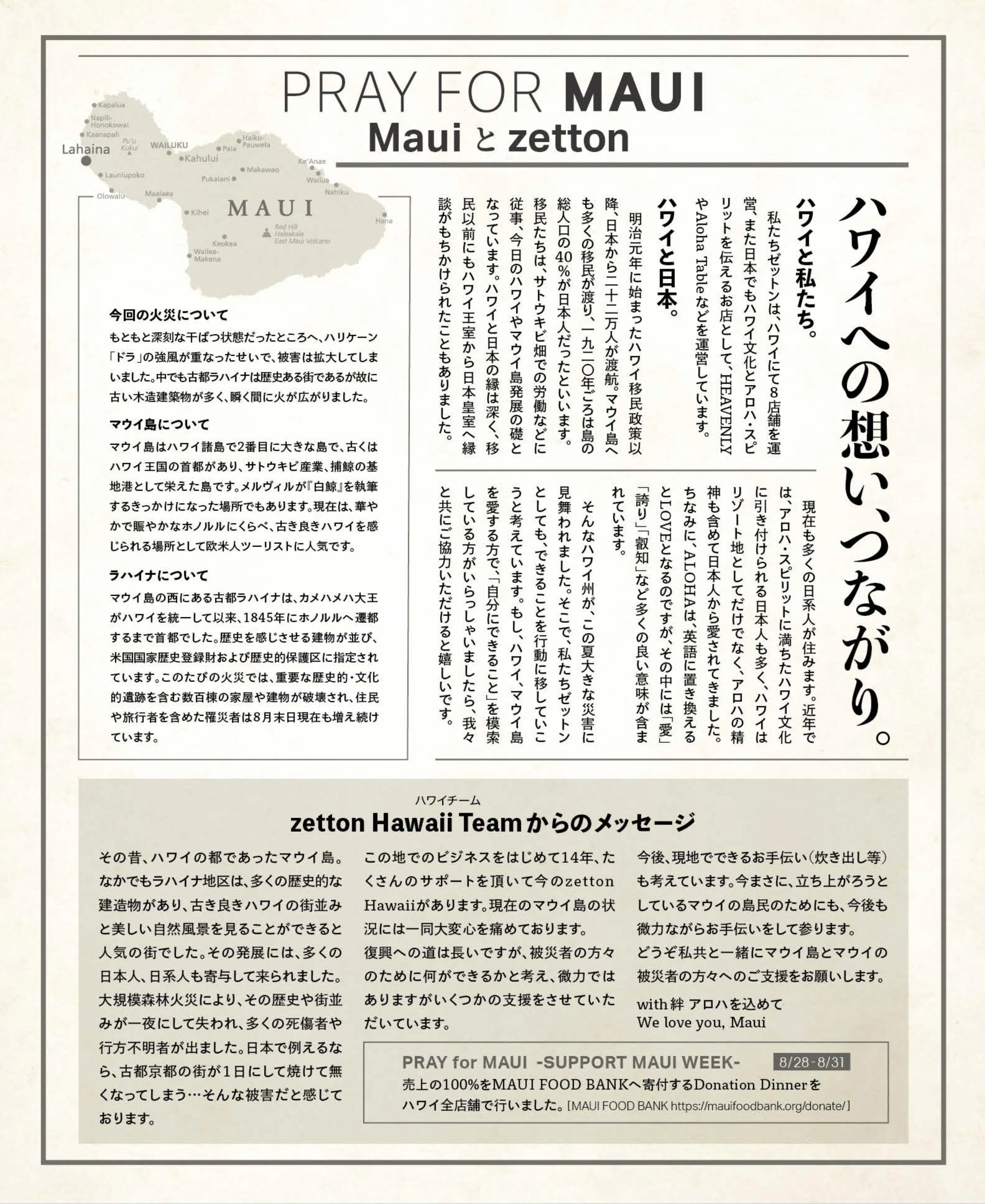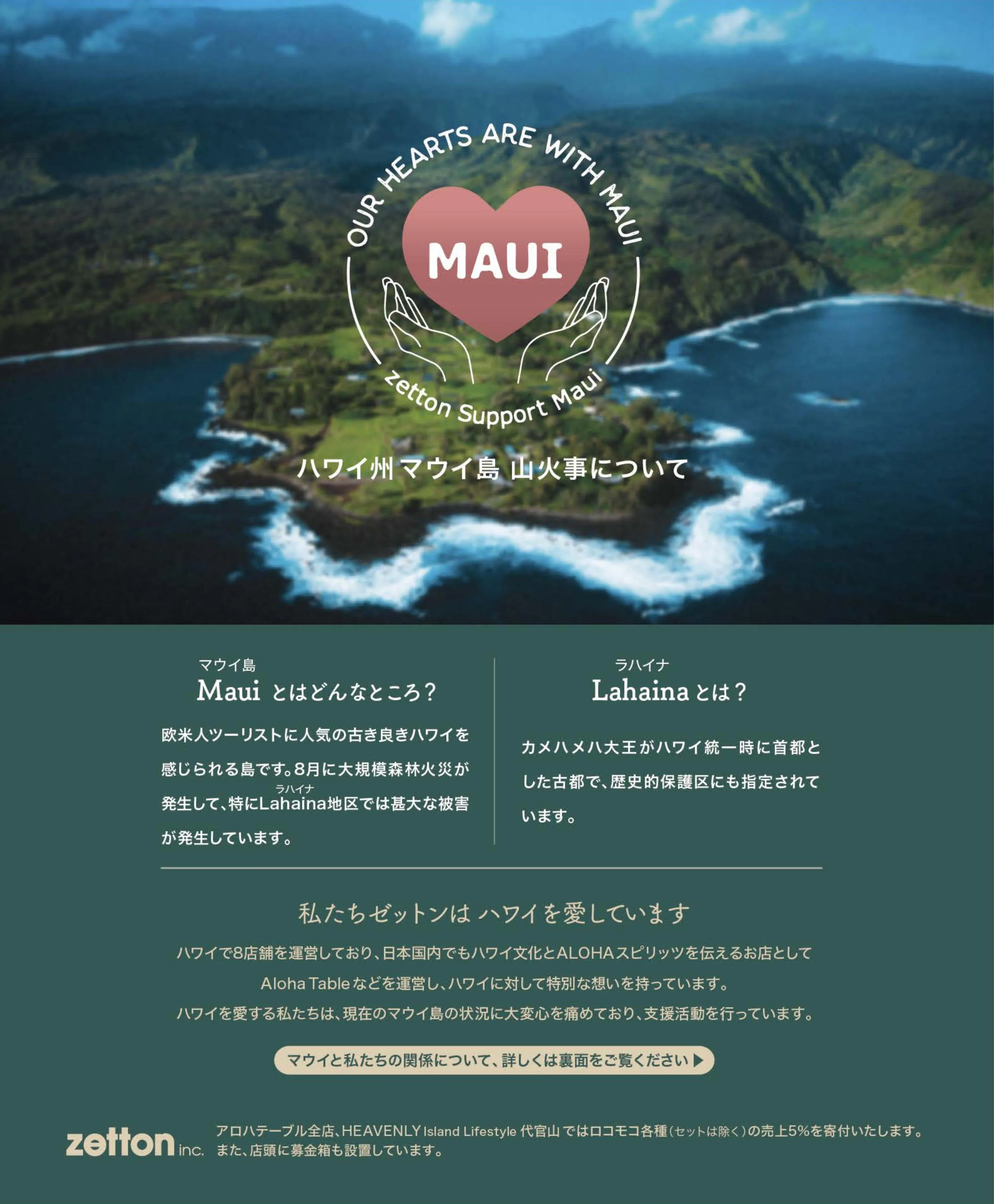 私たちゼットンは、ハワイにて8店舗を営業し、また日本国内でもハワイ文化とアロハスピリッツを伝える店舗を多数営業しており、ハワイへは大きな思い入れと感謝を感じています。そんなハワイにおける、この度のマウイ島被災について、Pray for MAUIとして、私たちにできることを模索しました。その結果、まずは、ハワイ全店舗でDonation Dinnerを行い、全店の売上の100%をMAUI FOOD BANKへ全額寄付し(https://www.zetton-inc.com/support-maui-week-by-zetton-inc)日本国内では、下記の施策を行うことといたしました。皆さまにもご協力を賜われましたら幸いです。