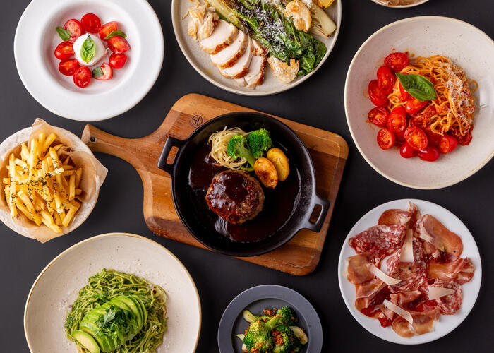 昼は、深いコクの濃厚デミグラスソースで味わうふっくらジューシーな自家製手こねハンバーグともちもち食感と小麦本来の香りが楽しめる具沢山の自家製・熟成生スパゲッティをお楽しみいただけます。特におすすめは、「KNEADERSボロネーゼ タリアテッレ」。店名である「KNEADERS」の由来である英語の「こねる」から着想を得た、ハンバーグと生スパゲッティの両方を一度に楽しめる贅沢な一皿です。